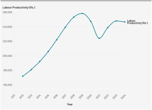 கீழே உள்ள படம் 2 இல் காட்டப்பட்டுள்ளபடி, தொழிலாளர் உற்பத்தித்திறன் அளவுகள் இன்னும் கோவிட்-க்கு முந்தைய அளவை எட்டவில்லை. மேலும் 2022-23 மற்றும் 2023-24 க்கு இடையில் அது குறைந்துள்ளது. அரசாங்கம் பொறுக்கி எடுத்து இந்த உலகத்திற்கு தம்பட்டம் அடிக்கும் வகையில் வெளியிடும் தரவுகள் ஒரு நல்ல படத்தை (உண்மையில் அது ஒரு பிம்பம் ) வரையலாம். ஆனால் உண்மையில் பொருளாதாரம் ஆரோக்கியமாக இல்லை என்பது தெளிவாகிறது. பொருளாதாரம் மோசமான சவால்களை எதிர்கொள்கிறது.