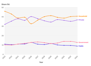படம் 3 என்பது GFCF வளர்ச்சியில் எந்த துறைகள் முக்கிய பங்கு வகிக்கின்றன என காட்டுகின்றது. இந்த தரவு காட்டுவது என்னவென்றால், வளர்ச்சி பெரும்பாலும் “குடும்ப” துறையால் உந்தப்படுகிறது. “குடும்ப” துறை என்பது குடியிருப்புக் கட்டிடங்கள், முறைசாரா குடும்ப நிறுவனங்களுக்கான இயந்திரங்கள், மற்றும் விவசாயக் குடும்பங்கள் சொத்துக்களில் முதலீடு செய்வது ஆகியவை அடங்கும்.